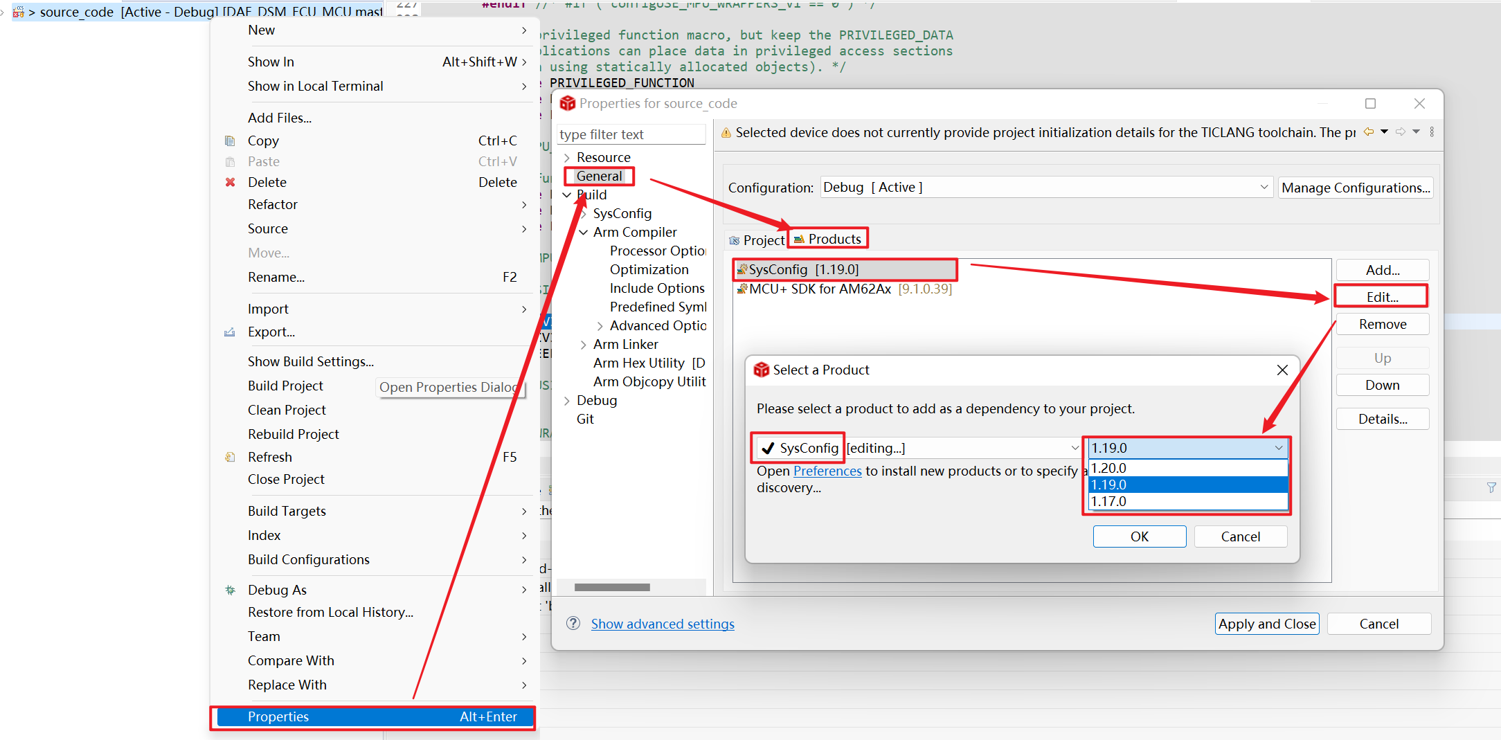 sysconfig版本需要和SDK版本匹配,如果不匹配需要自己在TI官网下载并安装SDK以及sysconfig。 修改版本方法见下图,SDK和sysconfig设置方法一致。