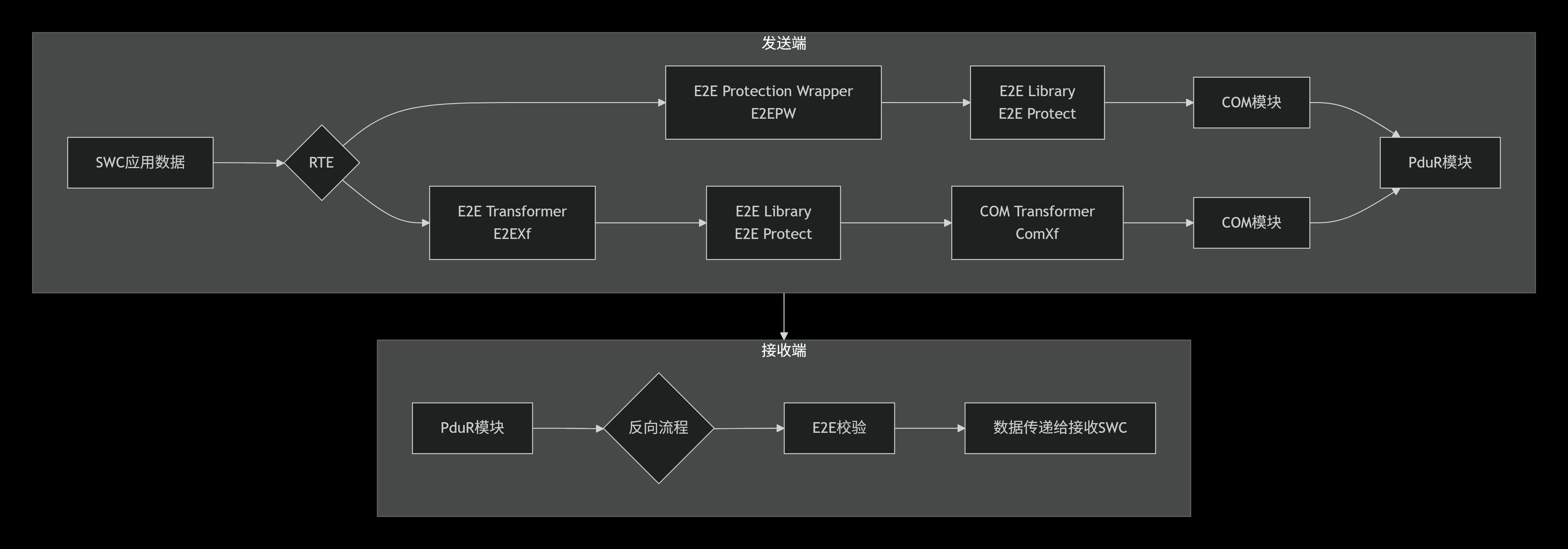 E2E Transformer (E2EXf)标准化集成位于RTE中,自动调用E2E库,实现SWC间通信数据的序列化/反序列化及E2E保护。对SWC透明